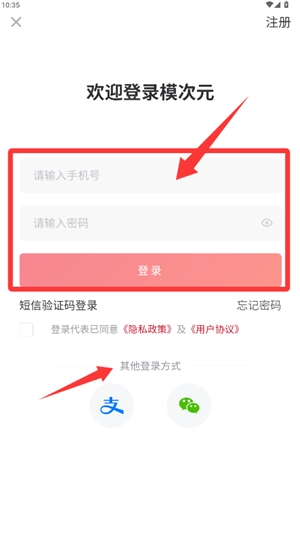 1、打开应用进入登录页,填写手机号与密码或选用其他方式登录。