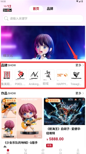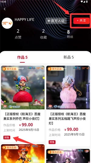 4、进入感兴趣的品牌主页,既可关注该品牌,也能查看作品与预售信息。