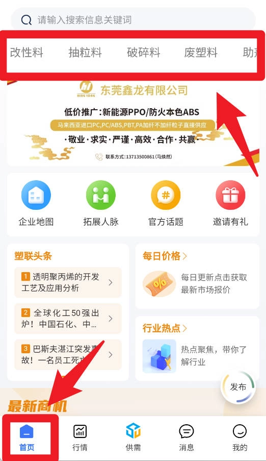 2、在首页你可以通过顶部分类栏快速进入改性料、抽粒料等频道,浏览每日价格、行业热点和塑胶头条。