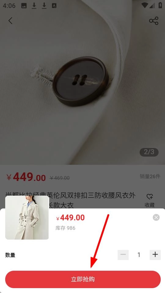 3、于该风衣商品页面,点击【立即抢购】按钮即可执行购买操作。