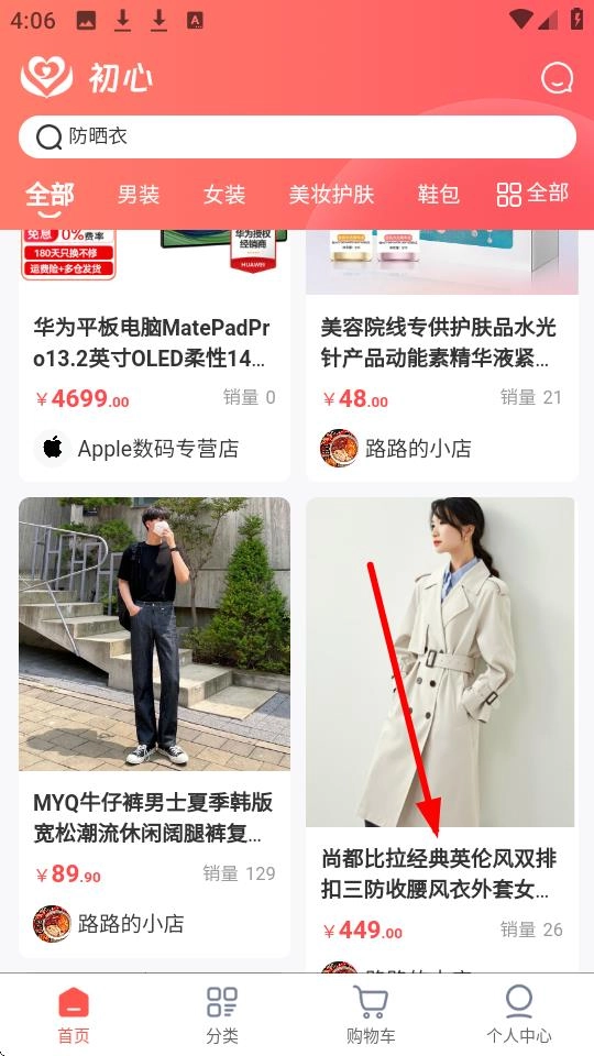 1、在首页,点击【尚都比拉经典英伦风双排扣三防收腰风衣外套女】可进入商品详情页。