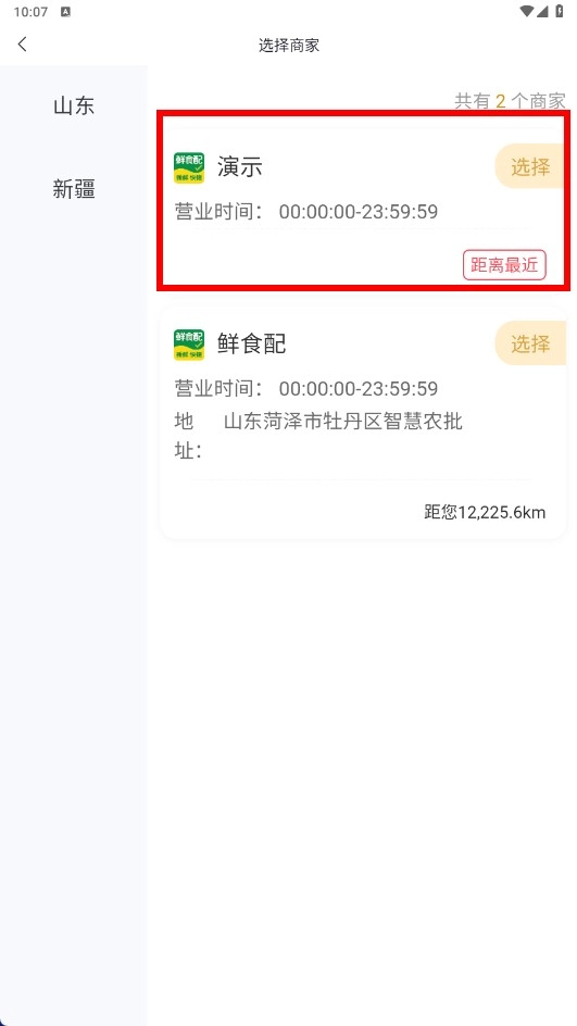 1. 鲜食配可通过选择商家进行采购,例如【演示】商家,查看其营业时间后,点击选择就能开启采购流程。
