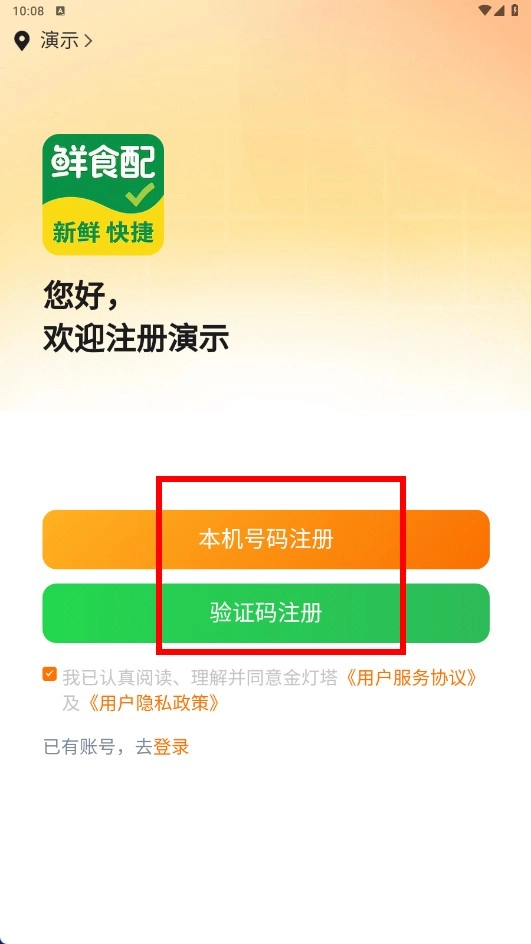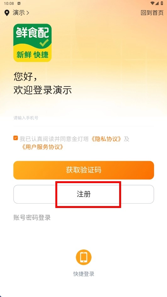 2、鲜食配登录页勾选协议后,点击【注册】按钮,即可进入注册流程,使用生鲜采购服务。