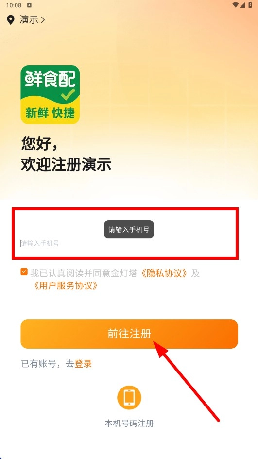 4、注册时在输入框输入手机号,勾选协议后点击【前往注册】,完成注册即可采购生鲜。