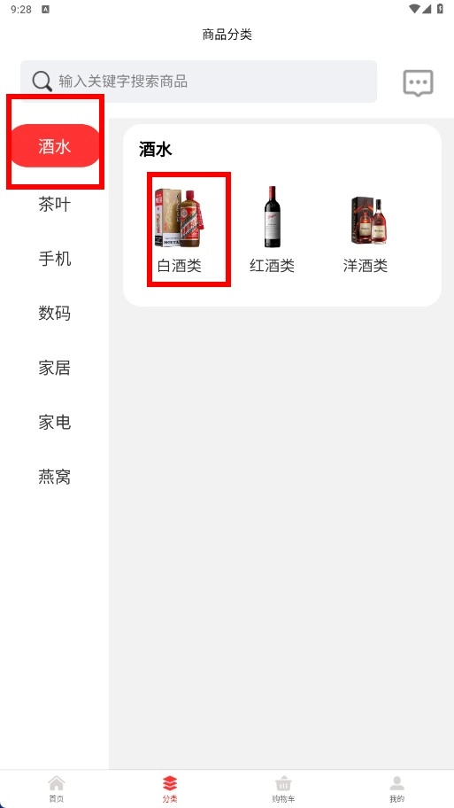 2、在商品分类页,选择【酒水】分类下的【白酒类】,可浏览各类白酒商品。