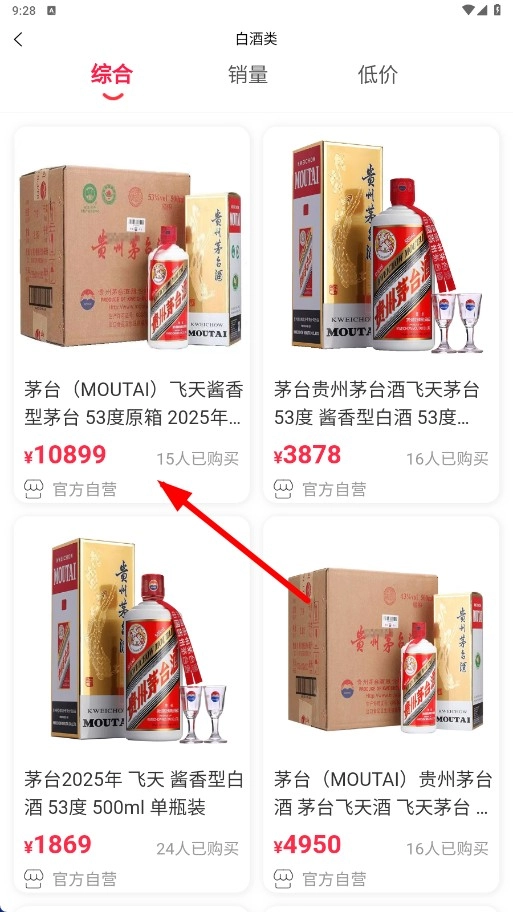 3、进入白酒类商品列表,可查看【茅台(MOUTAI)】等商品,了解价格、购买人数及是否自营。
