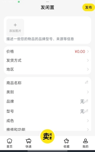 4、于卖闲置页面上传图片,填写价格、发货方式、地区以及商品信息,随后点击右上角的发布按钮即可。